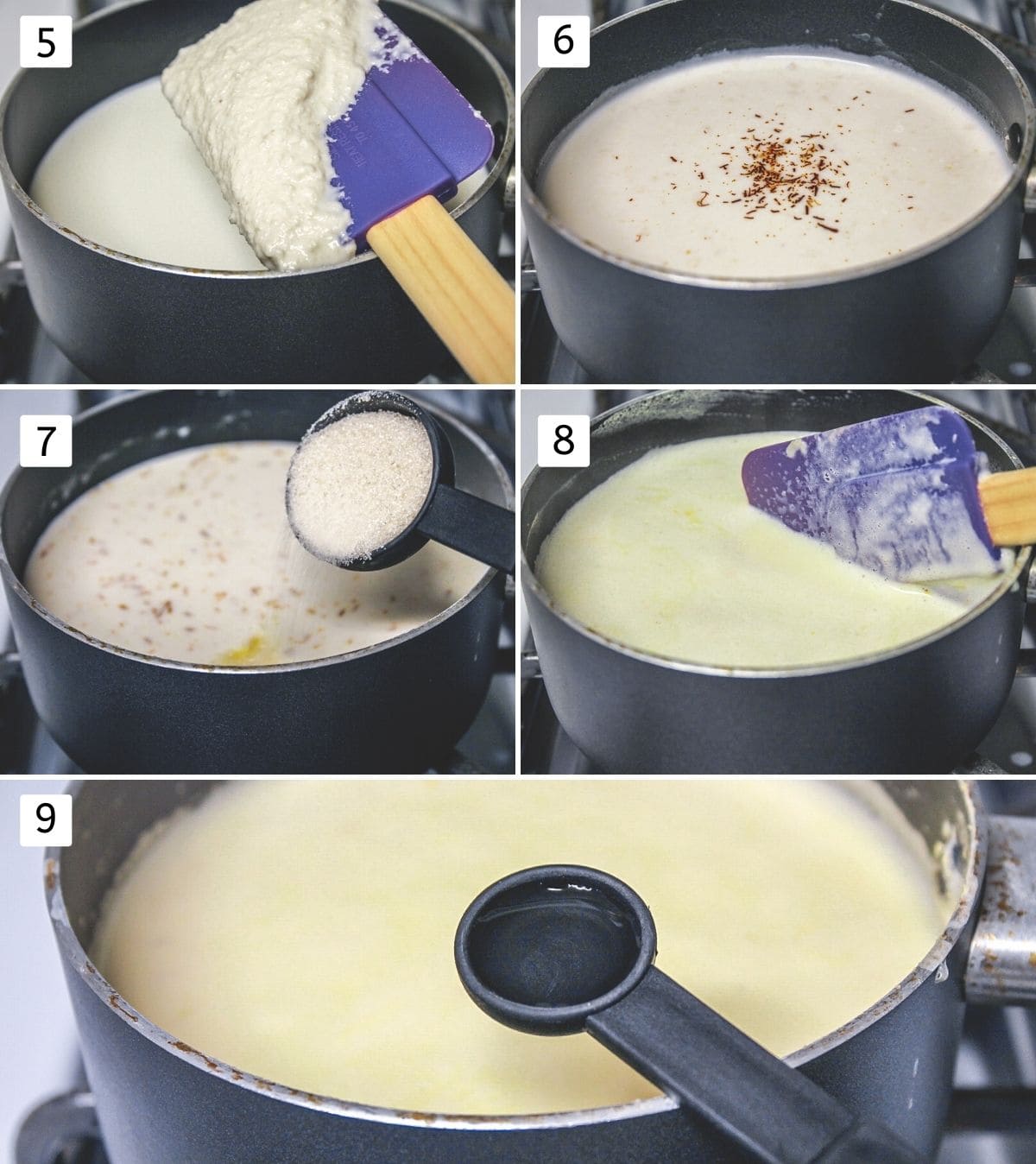 - Take milk in a saucepan and bring it to a boil on medium heat. Once it starts boiling add prepared nut paste and mix.