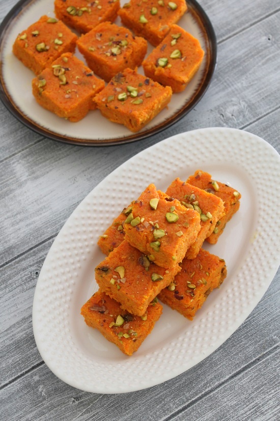 - Let it cool down completely and let it set. Then make the pieces using sharp knife. This gave me 16 thick pieces of carrot burfi. Carefully remove the carrot burfi pieces and arrange them on a serving plate or keep them in an airtight container. Serving suggestion: Enjoy this gajar barfi as a dessert after a meal or along with your meal. My family like to have a piece of barfi with a meal on a special occasion or festival. Check out other Barfi recipesWalnut burfi // Chocolate burfi // Kalakand // Besan barfi // Lauki barfi