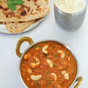 Serve with paratha or garlic naan or jeera rice. Serve sliced onion with lemon wedges and salted lassi on the side to complete the meal.